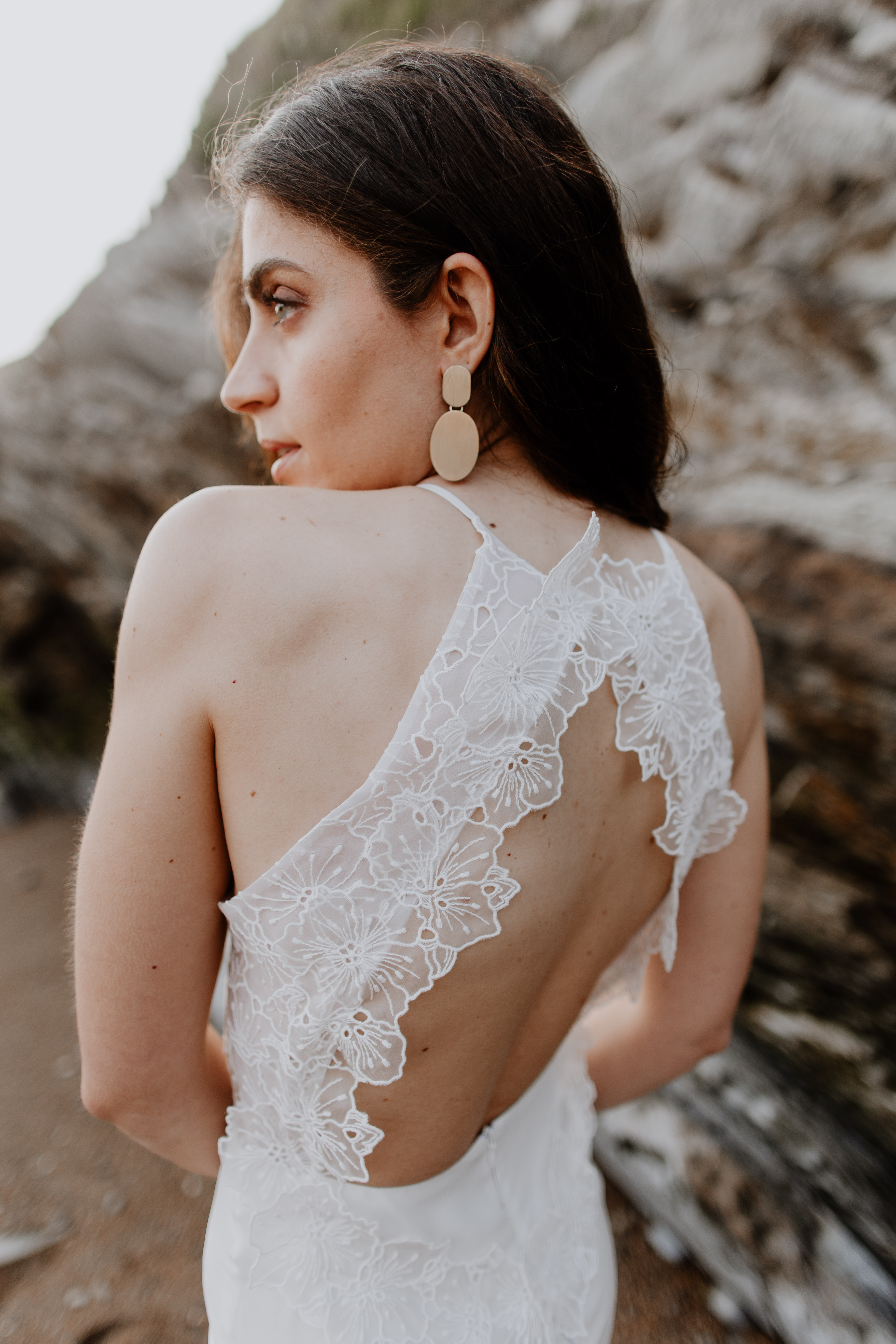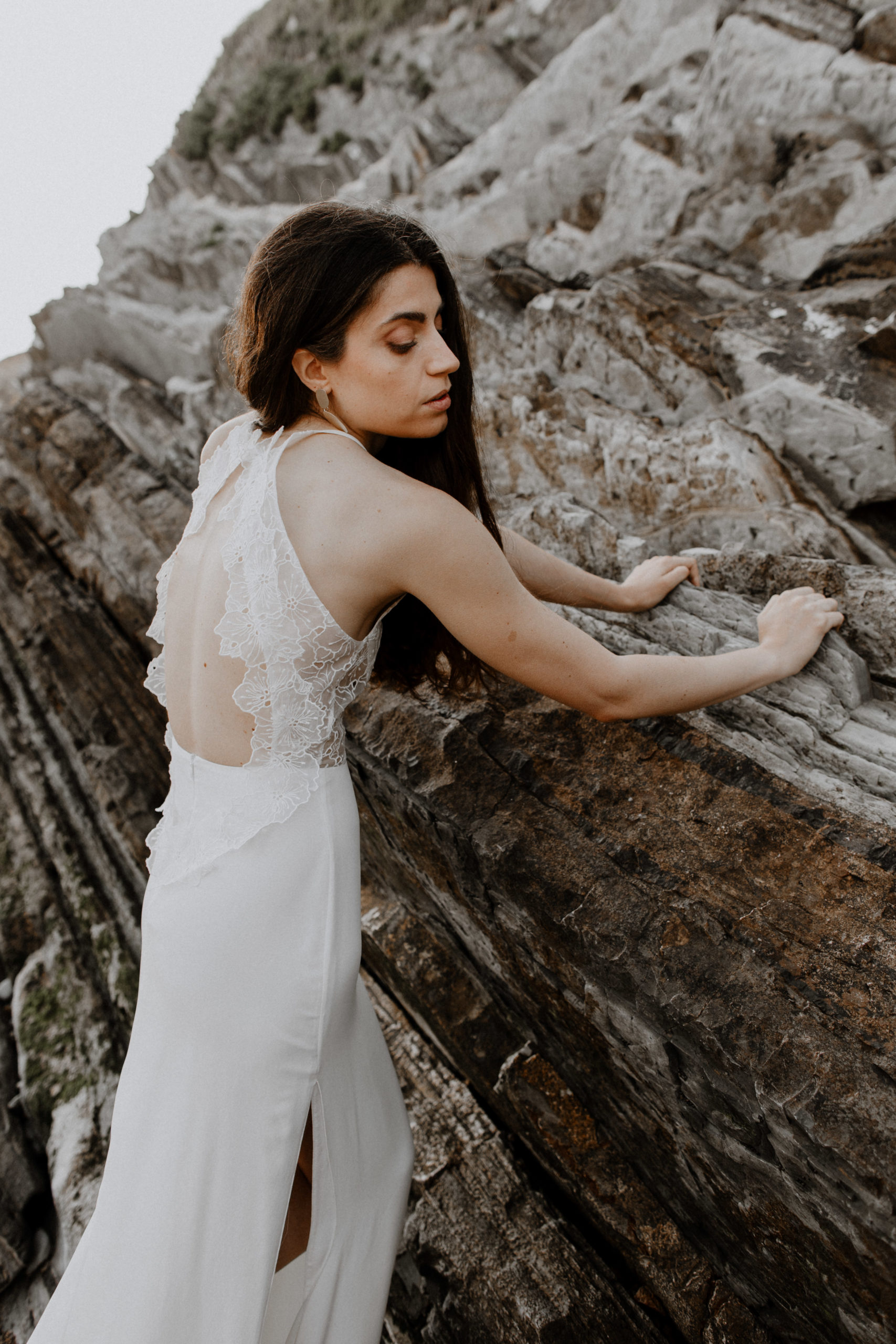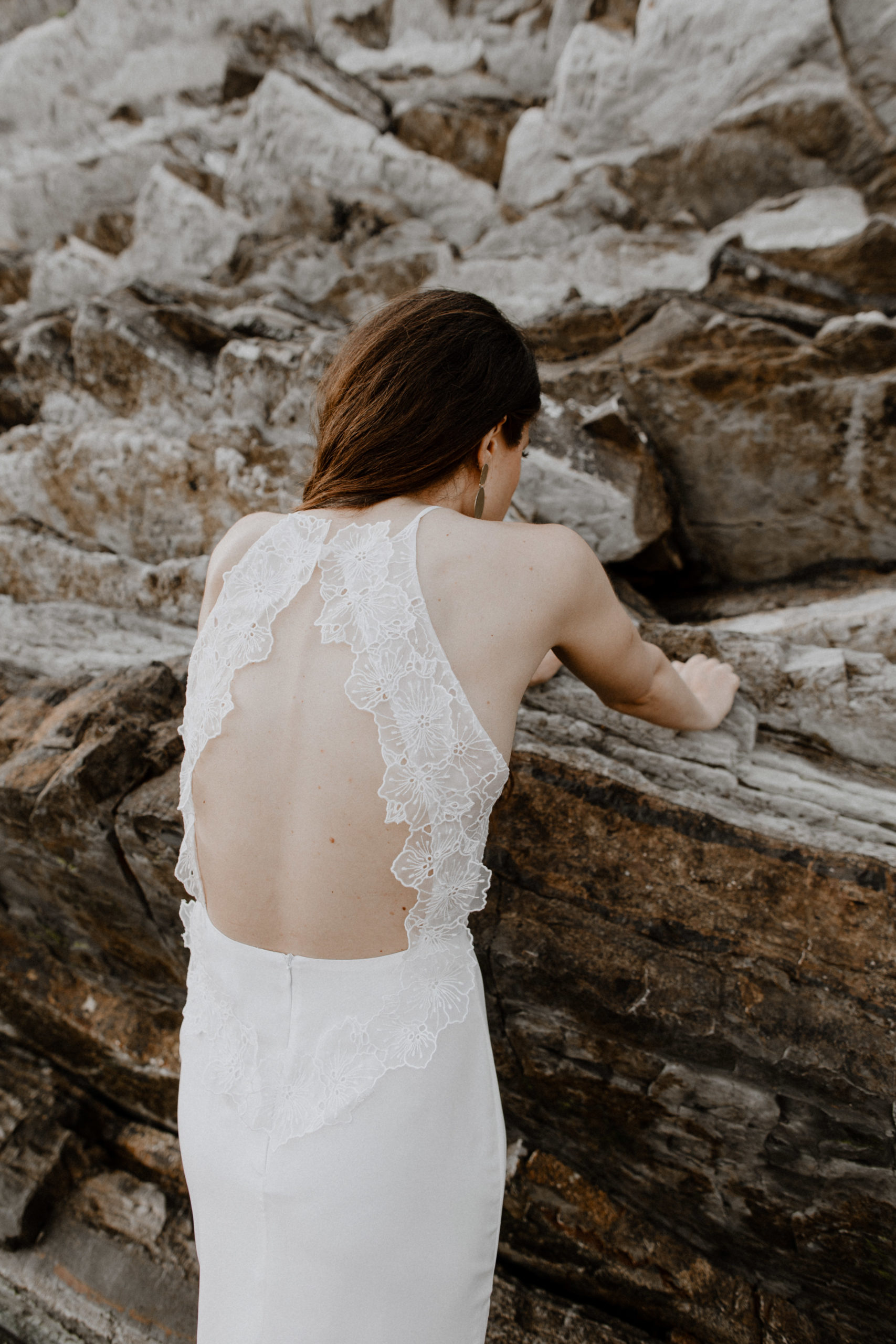 Robe de mariée avec coupe légèrement fourreau, fente côté et dos médaillon boutonné. Jeu de transparences dans les découpes devant et dos.