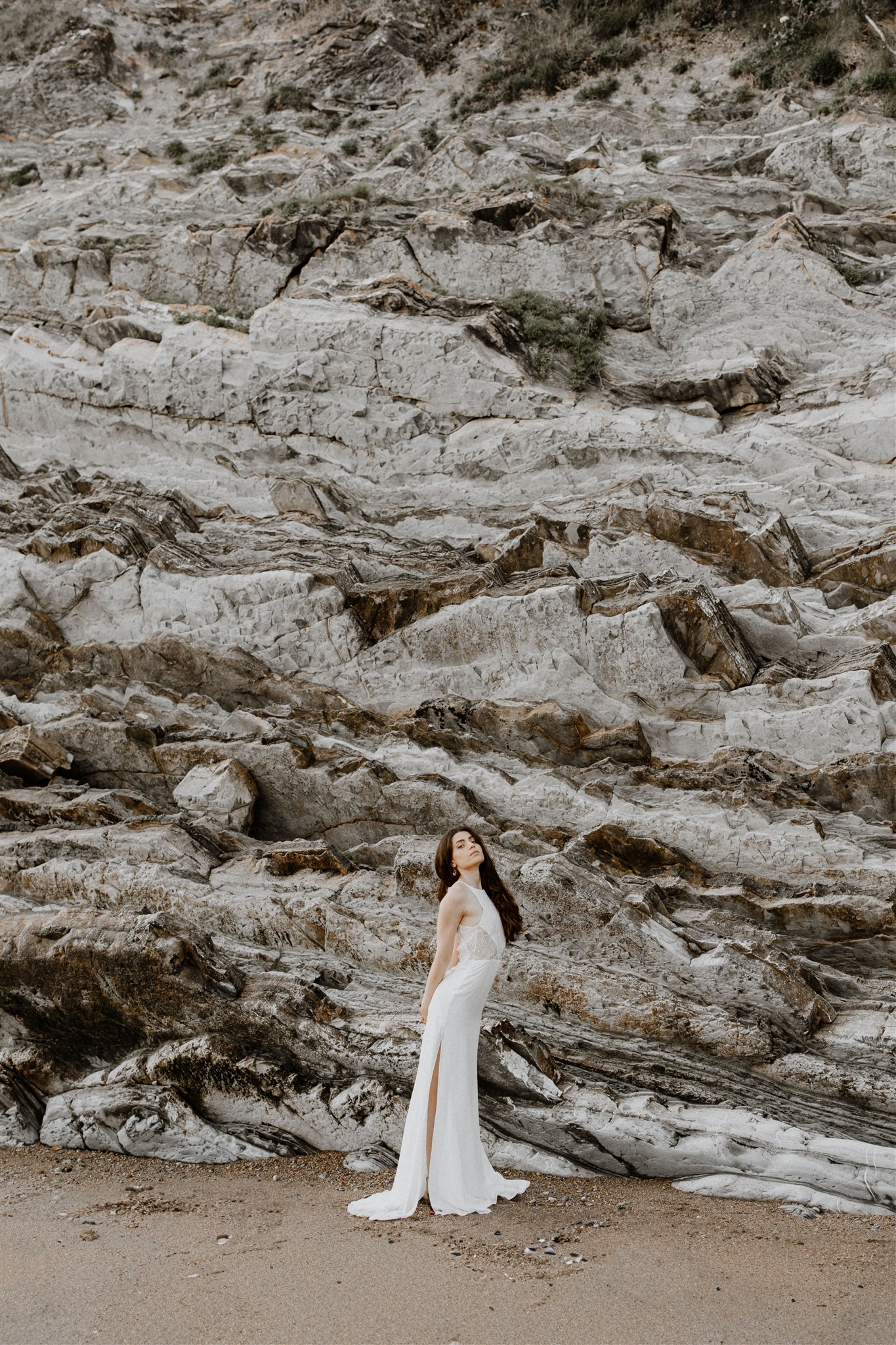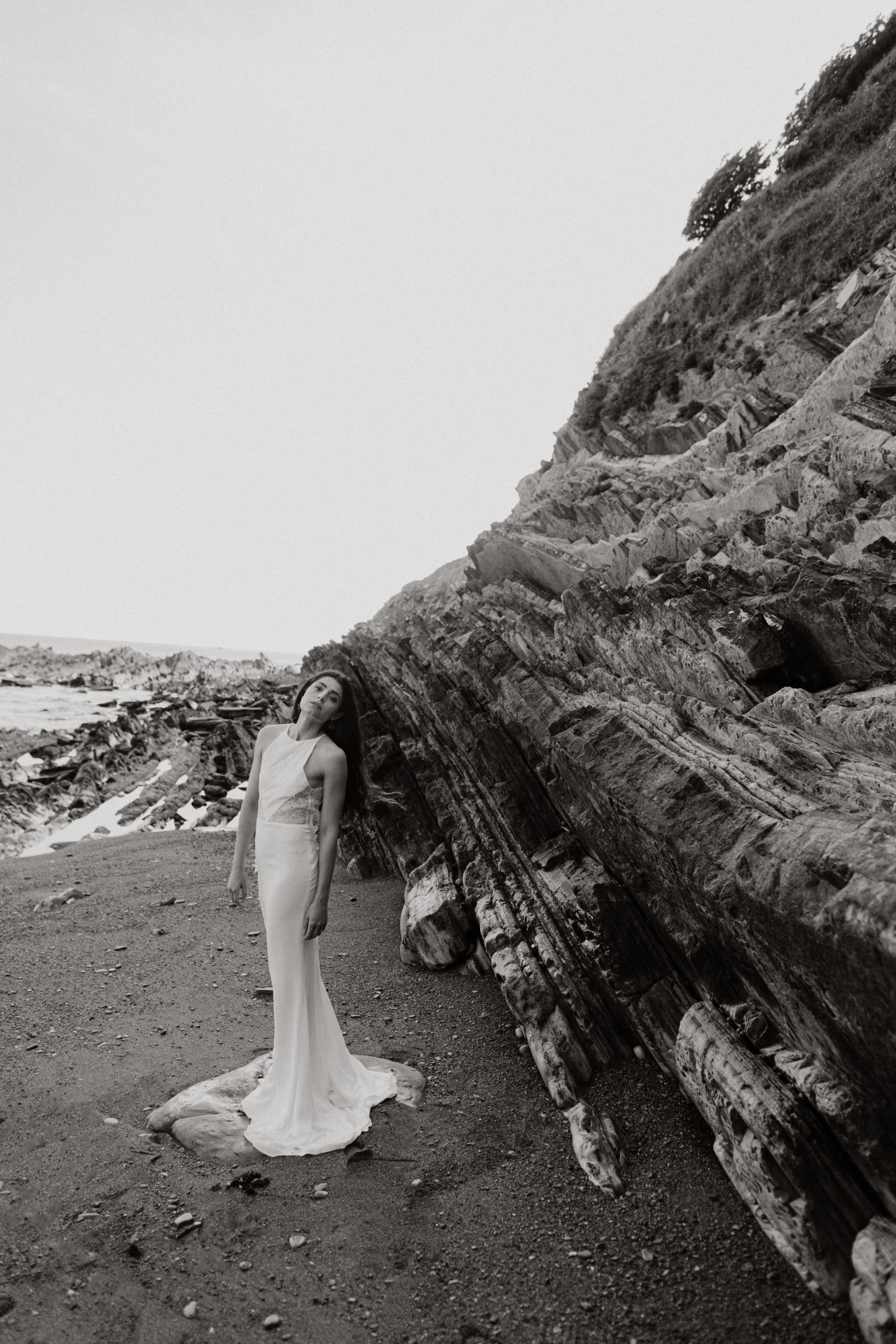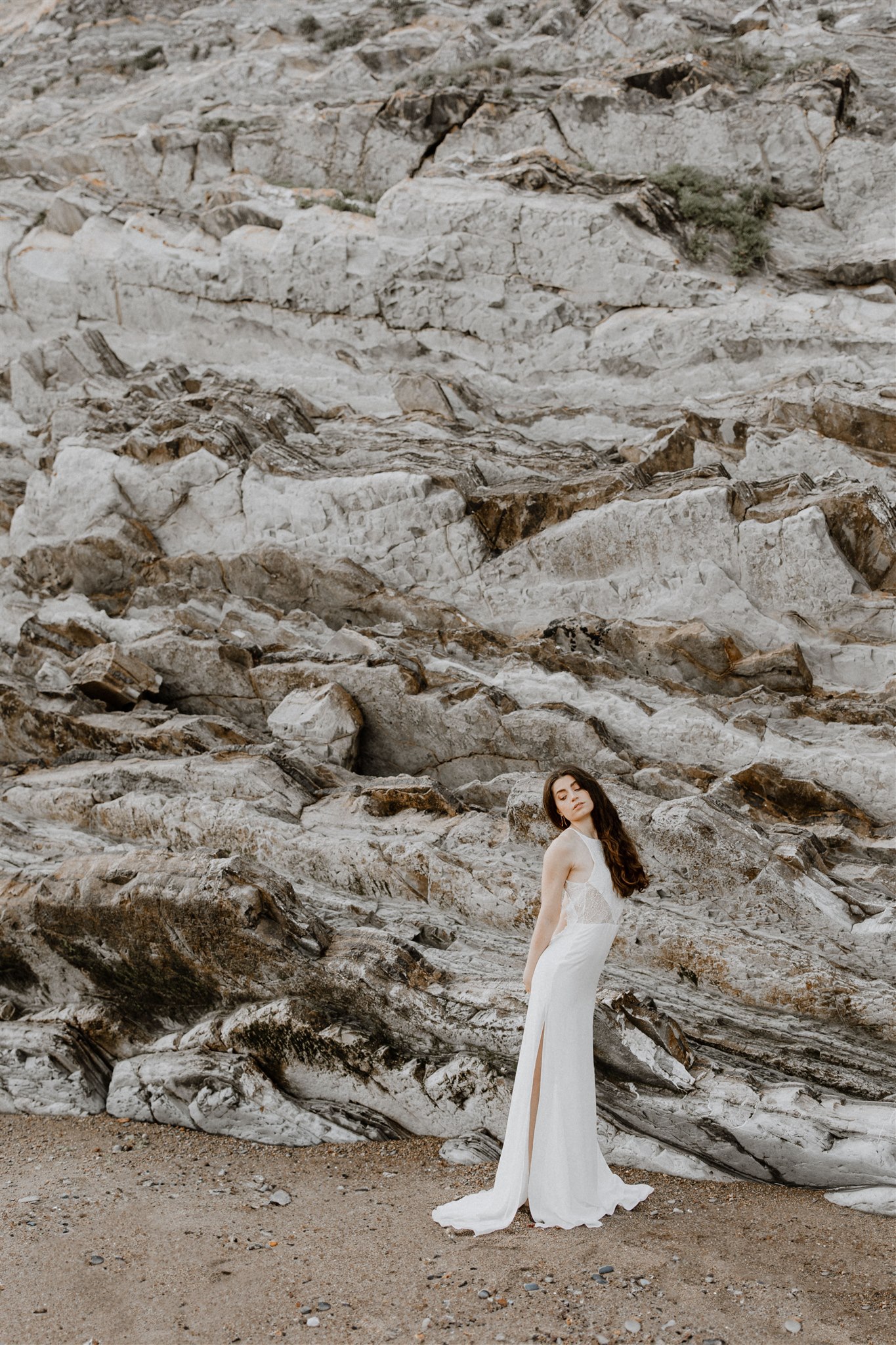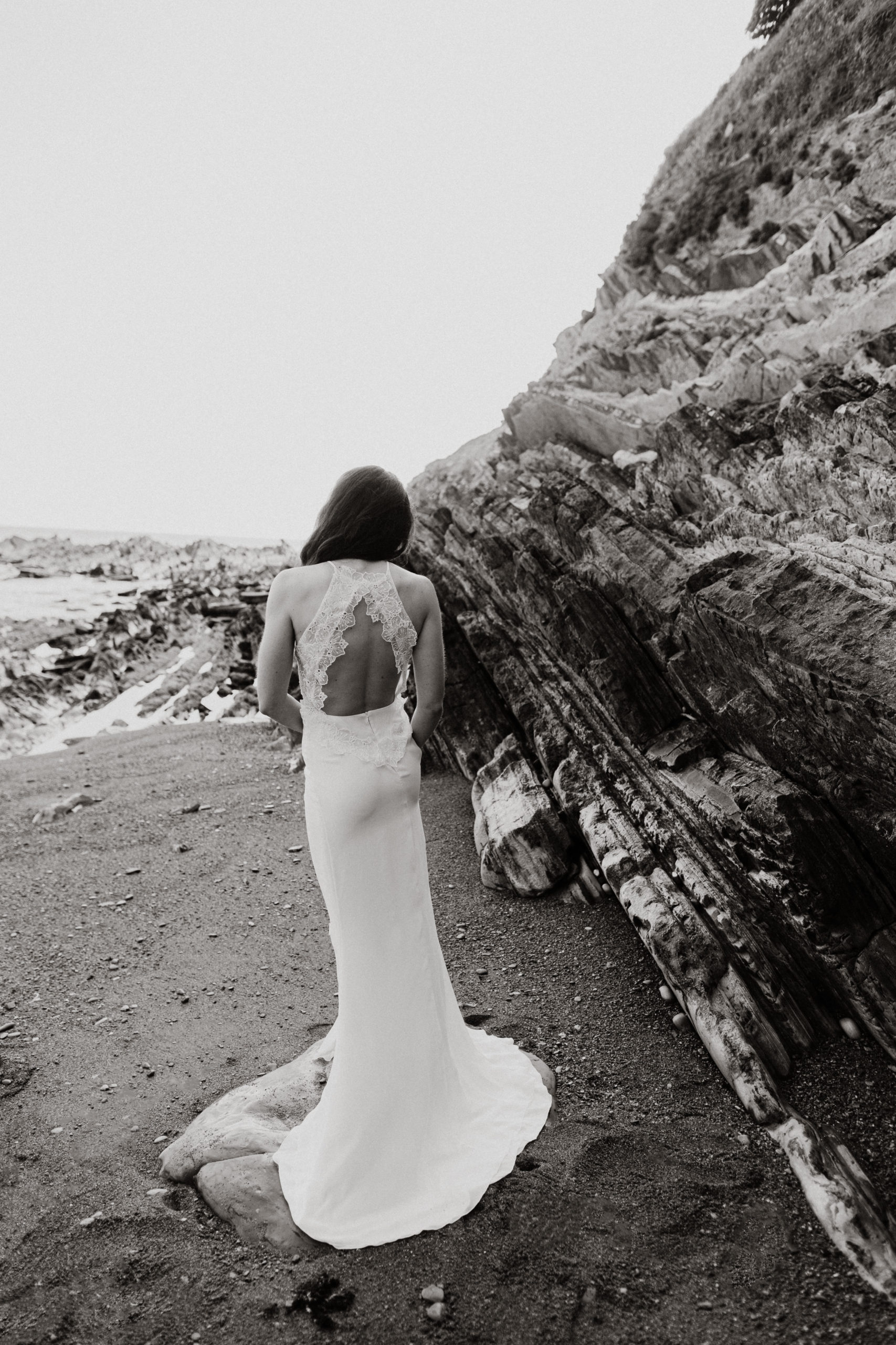 Robe de mariée avec coupe légèrement fourreau, fente côté et dos médaillon boutonné. Jeu de transparences dans les découpes devant et dos.