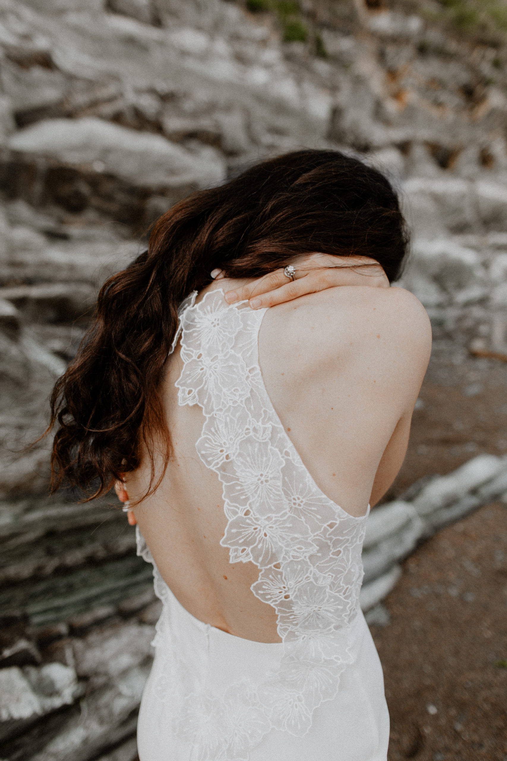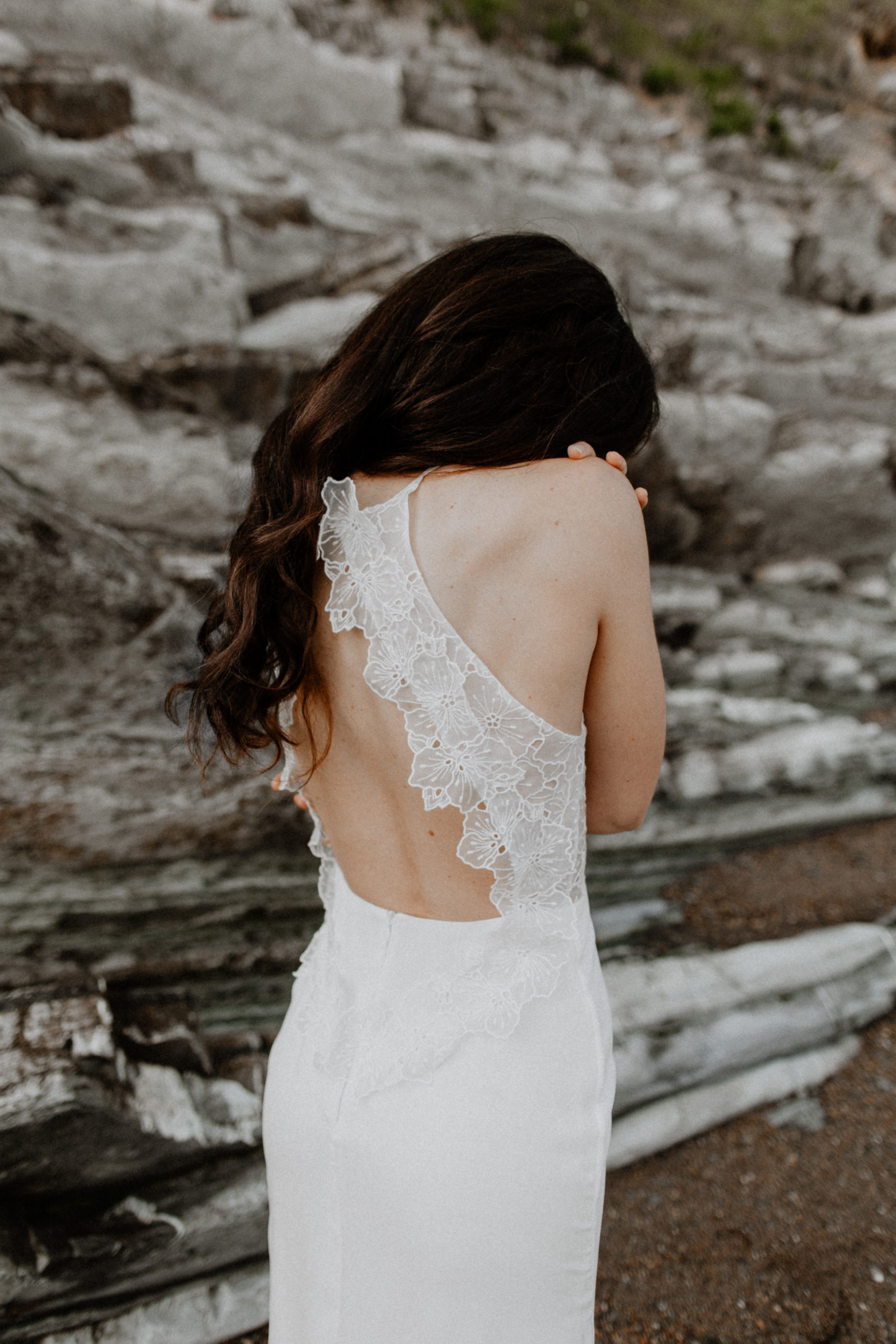Son dos médaillon est agrémenté d’un galon posé à la main en organza de soie brodé.